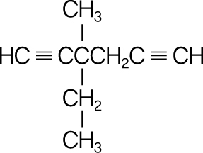 삼중결합을 모두 포함하면서 가장 긴 사슬인 모체는 탄소 6개의 사슬이 된다. 번호가 낮은 탄소에 3중결합이 먼저 해당되어야 하므로 3중결합이 1,5번 탄소에 존재한다. 이 탄소의 경우에는 왼쪽, 오른쪽에 번호를 매겨도 번호가 동일하므로 존재하는 치환기가 작은 번호를 갖도록 왼쪽부터 1번을 부여한다. 나머지 치환기 ethyl, methyl은 모두 3번 탄소에 존재하고 알파벳순으로 치환기의 이름을 붙이면 3-ethyl-3-methyl-1,5-hexadiyne가 된다.