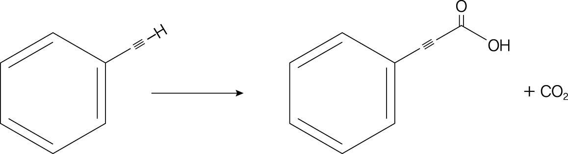 보기의 반응은 알카인의 산화성분해가 일어난 생성물을 나타낸다. 그러므로 1번의 산촉매 KMnO_4분해가 정답이 된다.