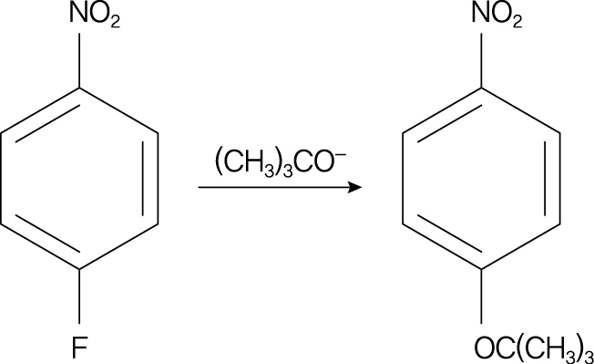 제시된 반응은 전자 끌어당김 효과가 큰 니트로기가 방향족 고리에 존재하고 이로 인해 고리의 친핵성 방향족 치환 반응이 가능해진다. 플루오린은 좋은 이탈기로 작용하며 강한 친핵체인 \displaystyle \text{tert-butoxide}가 공격하여 메이슨하이머 중간체를 형성한 후 방향족성이 회복된다. 이러한 과정은 대표적인 친핵성 방향족 치환 반응이며 메커니즘명은 \displaystyle \text{SNAr}이다.