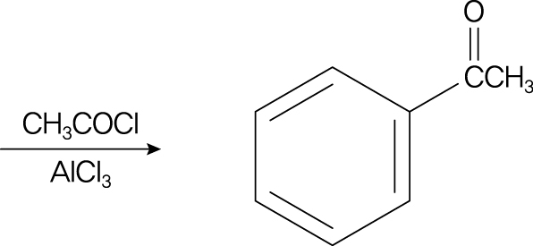 주어진 반응은 프리델 크래프츠 아실화 반응으로 아실 클로라이드가 방향족 화합물에 아실기를 도입한다. 생성물이 아세토페논이므로 아세틸기가 벤젠 고리에 결합한 구조가 된다. 따라서 반응물로 필요한 방향족 화합물은 벤젠이다.