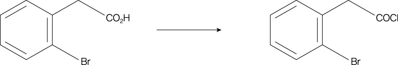 주어진 반응은 카복실산을 대응하는 아실 클로라이드로 전환하는 반응이다. 이 전환에는 주로 티오닐 클로라이드가 사용되며 반응 시 부산물은 기체인 이산화황과 염화수소이기 때문에 정제 과정이 간단하다. 그림에서도 카복실산이 아실 클로라이드 형태로 바뀌어 있으며 이는