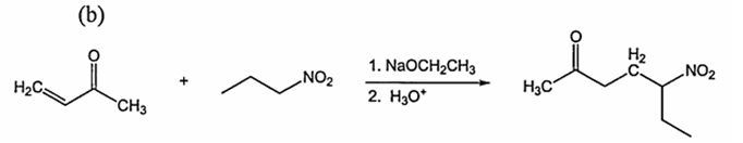 니트로에탄은 NaOEt에 의해 α-수소가 탈양성되어 니트로성 누클레오필(니트로카보아니온 유사체)을 만든다. 이 종은 α,β-불포화 케톤의 β탄소에 1,4-첨가하여 정-니트로케톤을 만든다.