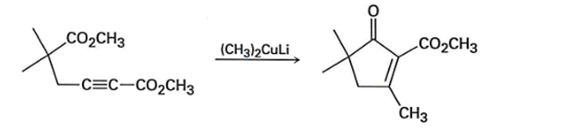 (CH₃)₂CuLi는 Gilman 시약으로 α,β-불포화계에 대해 주로 콘쥬게이션(1,4) 첨가를 일으켜 비분자형성 1,4-첨가(콘쥬게이션 첨가)를 수행한다. 그 후 형성된 중간체 인접한 에스터 작용기들이 내분자 결합하여 Claisen 유형의 축합(내부 Claisen 또는 유사한 에스터-에스터/에스터-케톤 고리화)을 통해 환형 β-케토에스터 유도체를 형성한다.