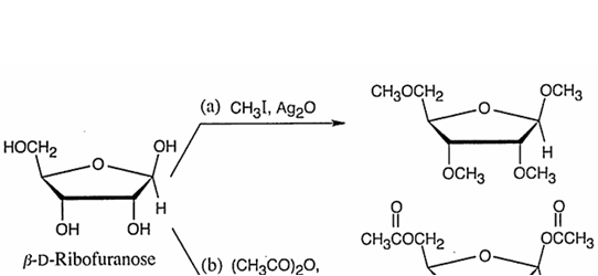\beta-D-ribofuranose로부터 다음과 같은 생성물을 얻었을 때 적절한 시약을 고르시오.