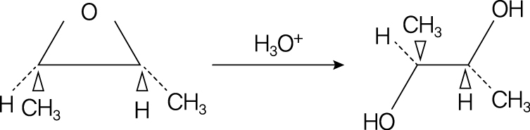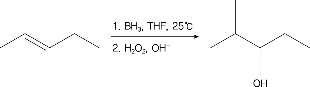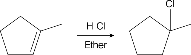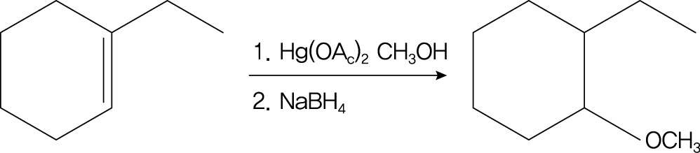 1번은 수소붕소화반응으로 안티마르코니프 생성물이 생성된다. 2번은 옥시수은 반응으로 물이 아닌 CH_3OH가 용매로 첨가됐으므로 -OCH_3기가 첨가되어야한다. 하지만 옥시수은 반응은 마르코니프 규칙을 따라야하므로 ethyl기가 있는 쪽에 첨가되어야 하므로 틀린보기이다. 3번은 수소화반응, 4번은 HCl 첨가 반응, 5번은 산촉매 에폭사이드 가수분해 반응이다.