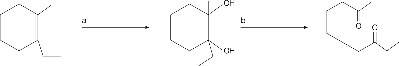 a의 반응의 생성물로 diol을 형성해야한다. OsO_4시약을 이용해서 하이드록시화를 진행하면 해당 생성물이 나오게 된다. 1,2 diol을 분해할 수 있는 시약은 HIO_4, H_3O^+이다. 따라서 답은 1번이다.