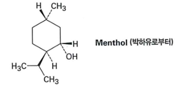 멘톨은 사이클로헥산 고리에 메틸기, 하이드록시기(OH), 아이소프로필기가 치환된 구조이다. 가장 안정한 의자형(conformation)에서는 모든 큰 치환기들이 equatorial(e) 위치에 있어야 입체장애가 최소화된다.