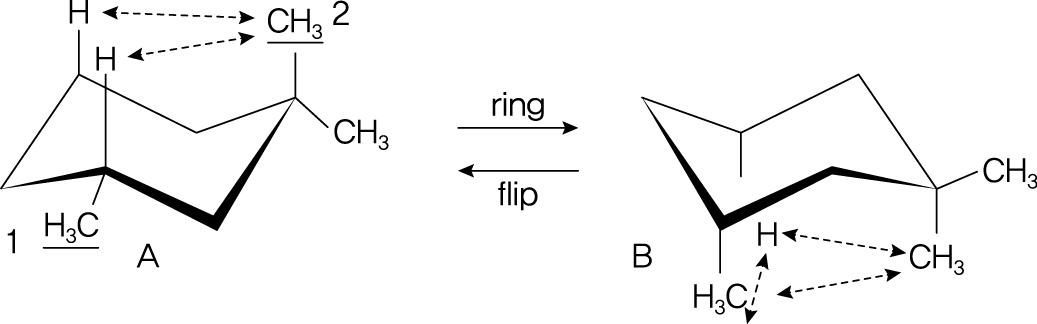 1번의 methyl기는 대쉬, 수평방향이다. 1번의 methyl기는 쐐기, 축방향이다. 그러나 A에는 1,3 이축상호작용이 2개 CH