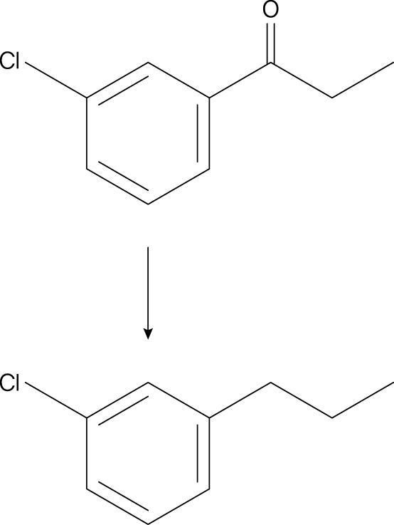 주어진 반응은 방향족 케톤의 카보닐기를 완전히 제거하여 단순한 알킬기로 바꾸는 환원 반응이다. 이때 중요한 점은 케톤이 알코올로 환원되는 것이 아니라 탄소-산소 결합 자체가 사라지며 산소가 제거되는 형태의 환원이라는 점이다.