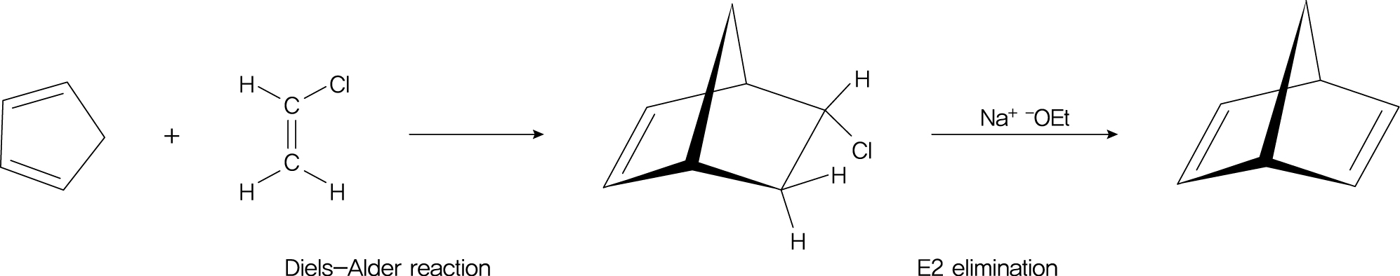반응은 먼저 Diels-Alder 반응으로 bicyclic 염소 치환체를 형성한 뒤, sodium ethoxide와 같은 염기 처리에 의해 염소가 제거되고 이중결합이 형성되면서 최종적으로 norbornadiene이 얻어진다.