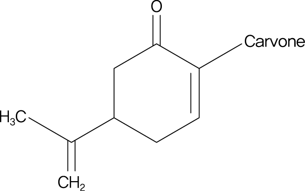 Carvone은 박하 향의 주요 성분으로 알려진 불포화 케톤이다. 질량 스펙트럼에서 분자 이온 피크(\displaystyle \text{M}^+)가 150이며, 세 개의 이중 결합과 하나의 고리를 포함하고 있다. 다음 중 carvone의 분자식으로 가장 적절한 것은?