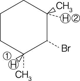 아래의 물질이 E2반응이 일어난다고 했을 때 1,2번 수소 중 (a)번 수소가 제거되고 그 이유는 E2 제거 반응이 일어날 때 제거되는 수소와 이탈기가 (b) 준평면을 형성하는 것이 유리하기 때문이다. 그 결과 (c)치환 알켄이 생성된다. a, b, c