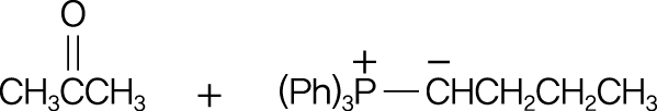 \displaystyle \text{Wittig} 반응은 케톤 또는 알데하이드의 카보닐 탄소와 일리드의 탄소가 결합하여 알켄이 생성되는 반응이다. 주어진 케톤 \displaystyle \text{CH}_3\text{COCH}_3에서 카보닐 탄소가 일리드의 탄소와 결합하며 산소는 포스핀 산화물로 제거된다. 따라서 케톤의 메틸기 하나와 일리드의 알킬 사슬이 이중결합을 형성하여 \displaystyle \text{CH}_3\text{C(CH}_3\text{)=CHCH}_2\text{CH}_2\text{CH}_3 가 생성된다.