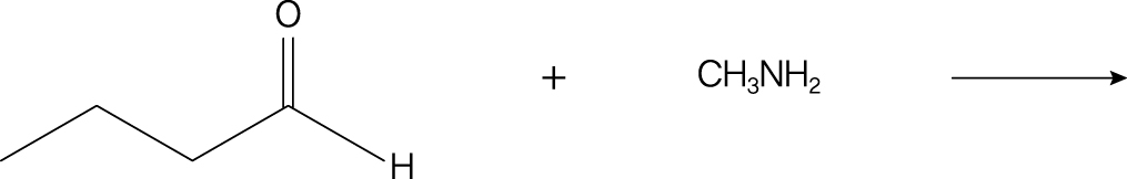 알데하이드는 \displaystyle 1차 아민과 반응하여 이민을 형성한다. 먼저 카보닐 탄소에 아민이 친핵 공격하여 카비놀아민 중간체가 생성되고 이어서 탈수 반응이 일어나 이민이 형성된다. 주어진 반응에서는 부탄알과 메틸아민이 결합하여 최종적으로 메틸 치환 이민 구조가 생성된다.
