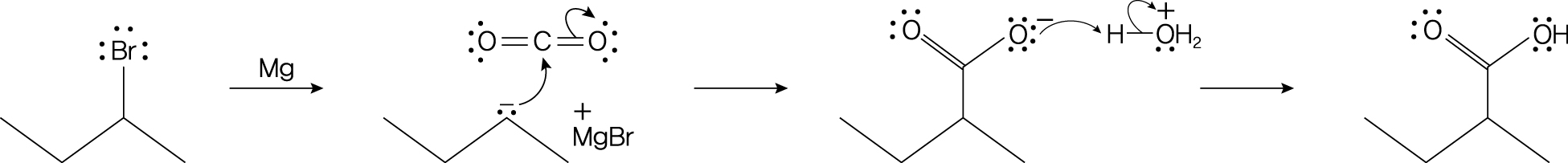생성된 카복실산의 구조를 보면 알킬 부분이 \displaystyle \text{sec-butyl} 구조로 되어 있다. 이는 \text{Grignard} 시약이 \displaystyle \text{2-bromobutane}에서 유래했을 때 얻어지는 구조와 정확히 일치한다.