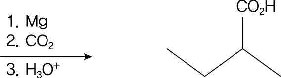 \displaystyle \text{Mg}와 반응해 \text{Grignard} 시약을 만들고 \displaystyle \text{CO}_2 처리 후 산성 가수분해하여 카복실산을 만드는 고전적 합성 경로이다.