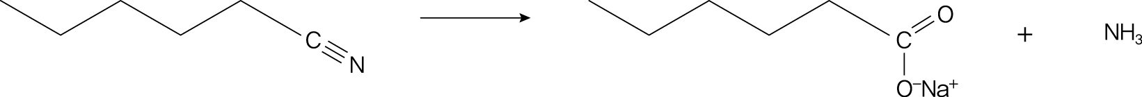 니트릴(\displaystyle \text{C}\equiv\text{N})은 염기성 조건의 가수분해를 통해 카복실산염과 암모니아로 전환된다. 따라서 \displaystyle \text{NaOH}와 \displaystyle \text{H}_2\text{O}가 필요한 시약이다.