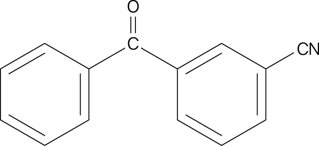 \displaystyle \text{benzoyl} 치환기는 벤조니트릴 고리의 \displaystyle 3번 위치에 존재한다.