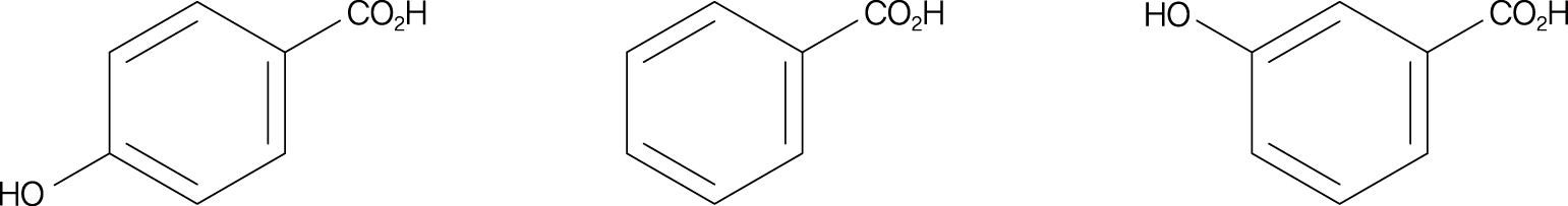 \displaystyle m-하이드록시벤조산의 경우, 카복실레이트 음이온의 음전하가 \displaystyle -\text{OH}의 전자를 끄는 유도 효과에 의해 안정화되며, 이로 인해 이 이성질체가 더 산성이 강해집니다.