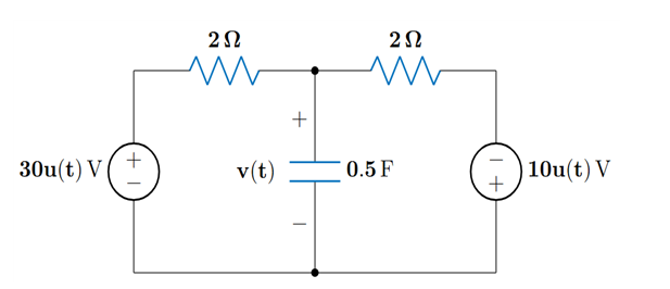 \frac{\frac{30}{s} - V(s)}{2} + \frac{-\frac{10}{s} - V(s)}{2} = \frac{V(s)}{\frac{2}{s}} 이므로 V(s) = \frac{20}{s(s+2)} 이다.