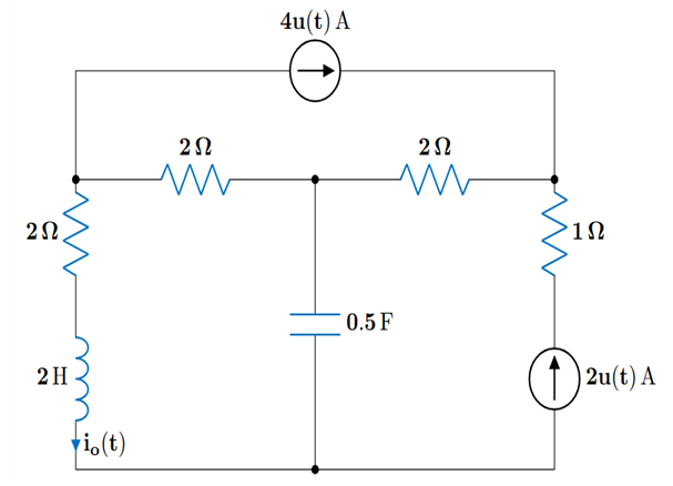여기서 구하려는 전류를 구하면, I_o(s) = \frac{V_1(s)}{2s+2} = \frac{2-4s}{s(s+1)^2} 이다. 라플라스 역변환을 진행하면 i_o(t) = 2 - 2e^{-t} - 6te^{-t} 이므로 답은 ①이다.