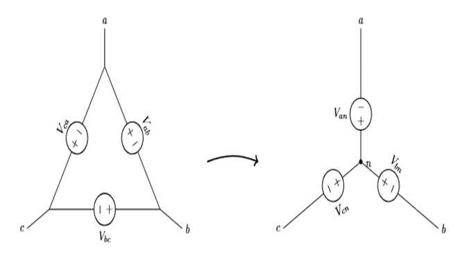 다음 3상 평형 전압원(\Delta \rightarrow Y) 회로에서 V_{ab} = V_m \angle 0^\circ 일 때, V_{ab}의 값으로 알맞은 것은?