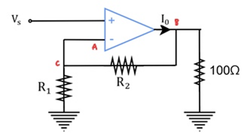 다음 회로의 op-amp는 ± 20V 공급에서 작동하고 출력은 200mA를 넘을 수 없다. R_1+R_2=9.9k\Omega이고 V_s=1V일 때, 증폭기의 가능한 최대 허용 이득을 구하시오.