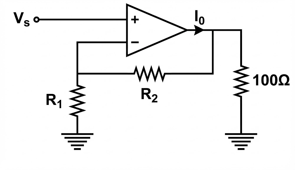 \displaystyle I_0=\dfrac{V_s}{R_1}+\dfrac{\dfrac{9.9k}{R_1}}{100}=\dfrac{100}{R_1}\le0.2,\ R_1\ge500(\Omega)