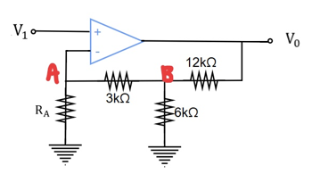 \displaystyle \frac{V_1}{R_A}+\frac{V_B}{6k}=\frac{V_0-V_B}{12k}