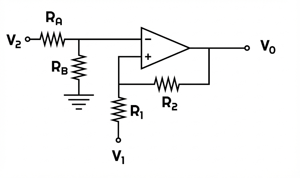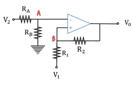 \displaystyle=-\dfrac{R_2}{R_1} V_1+\left(1 + \dfrac{R_2}{R_1}\right)\dfrac{R_B}{R_A + R_B} V_2