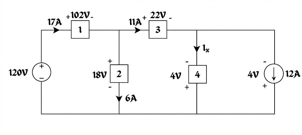 \displaystyle \sum P = 0 = 17(-120 + 102) + 6(18) + 11(22) + I_x(4) + 12(-4),\quad I_x = -1A