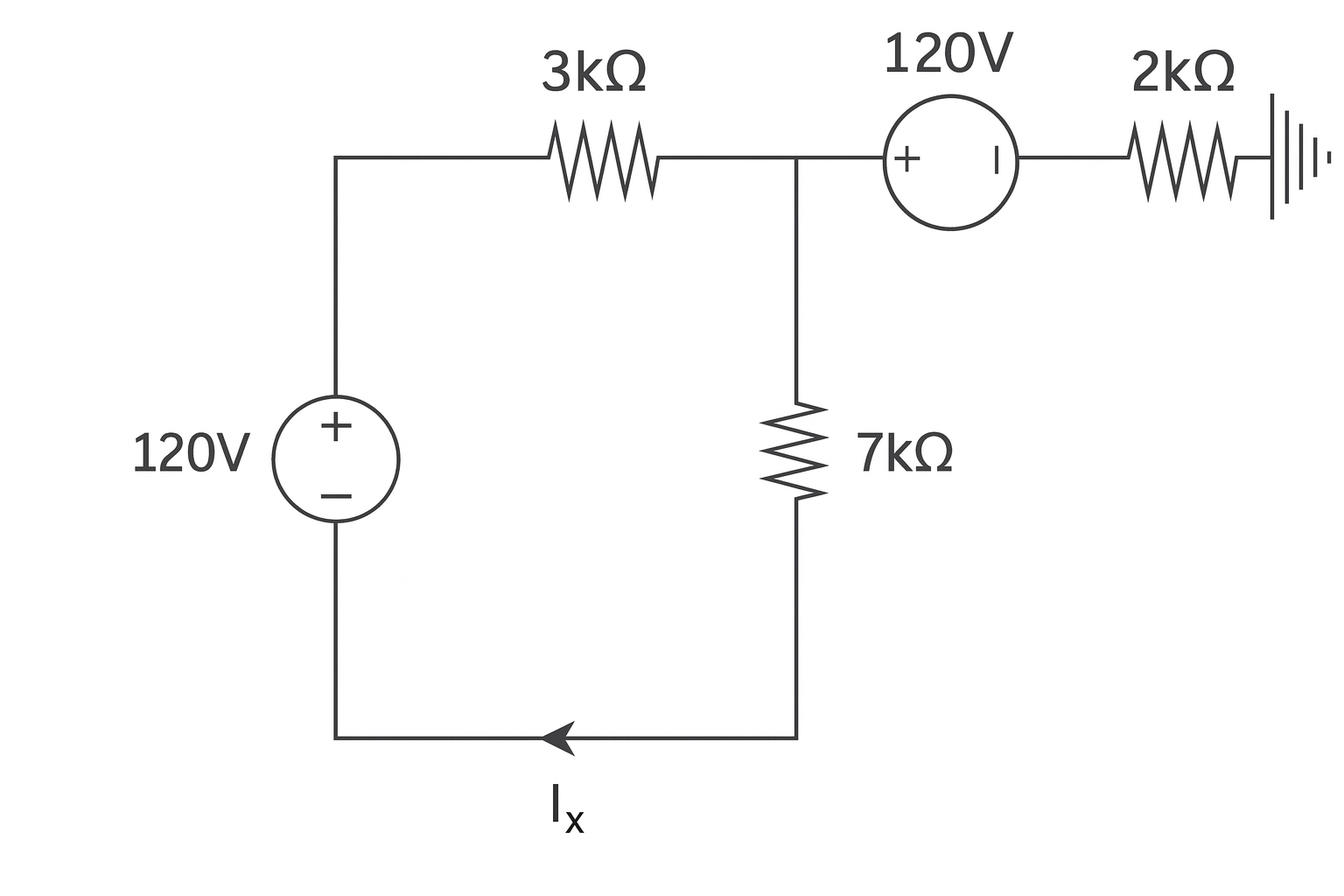 오른쪽 ground와 연결된 회로에 흐르는 전류는 무관하므로, \displaystyle I_x = \frac{120}{3k + 7k} = 12(mA)