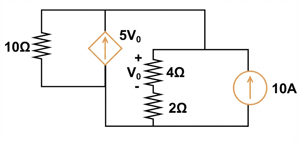 \displaystyle V_0 = (10 + 5V_0)\times \dfrac{10}{10+6} \times 4,\quadV_0 = -\dfrac{50}{23}\ (\text{V})