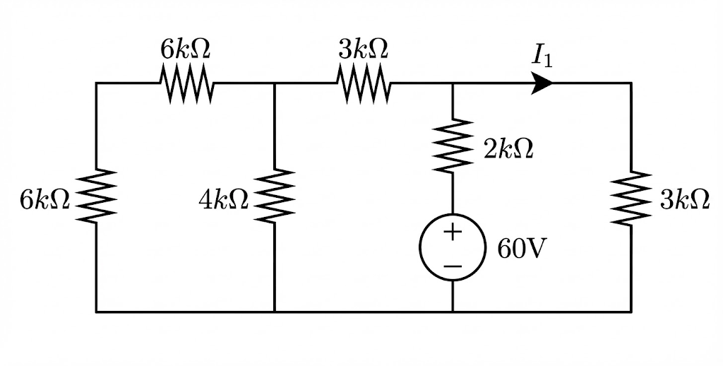 왼쪽의 등가저항은 R_{\mathrm{eq}} = 3 + 4\parallel(6+6) = 6(\mathrm{k}\Omega)가 되므로 등가회로는 아래 그림과 같다.I_1 = \dfrac{60}{2+3\parallel 6} \times \dfrac{6}{3+6} = 10(\mathrm{A})