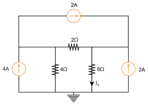 V_1 = \displaystyle\frac{40}{3}(\mathrm{V}),\;V_2 = 16(\mathrm{V})\;\rightarrow\;I_x = \frac{V_2}{6} = \frac{8}{3}