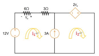 \displaystyle i_2 - i_1 = 3,\quad 12 - 9i_1 + (-12i_1) = 0