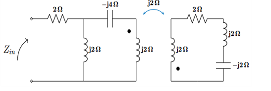 \displaystyle Z_{in} = 2 + (j2 \parallel (-j4 + j2 + 1 - j1)) = 2 + (j2 \parallel (1 - j3))