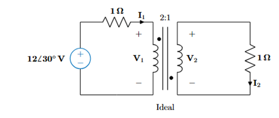 1차측에서 본 총 저항은 Z_{tot} = 1 + 4 = 5이므로 I_1 = 2.4 \angle 30^\circ 이다. 이상적인 변압기의 성질에 의해 I_2 = -2I_1 이 성립한다. 따라서 I_2 = -4.8 \angle 30^\circ 이므로 답은 ①이다.