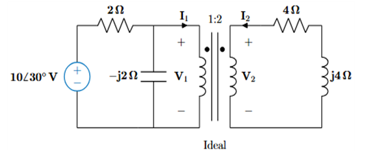 이상적인 변압기의 성질에 의해 V_2 = 2V_1 이므로 V_2 = 10 \angle 30^\circ 이고 답은 ②이다.