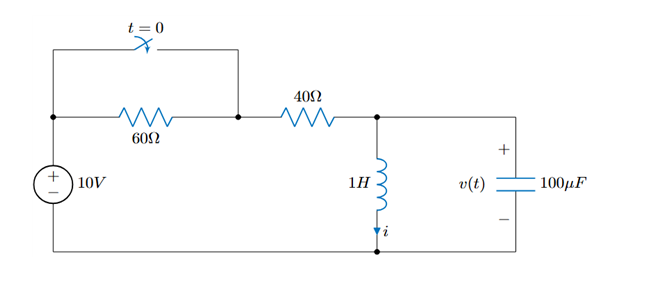 t < 0일 때의 상황에서 정상상태 응답을 구하여 t = 0일 때 초기 조건을 구하면 i(0) = 0.1\text{A}, v_c(0) = 0\text{V} 이다.