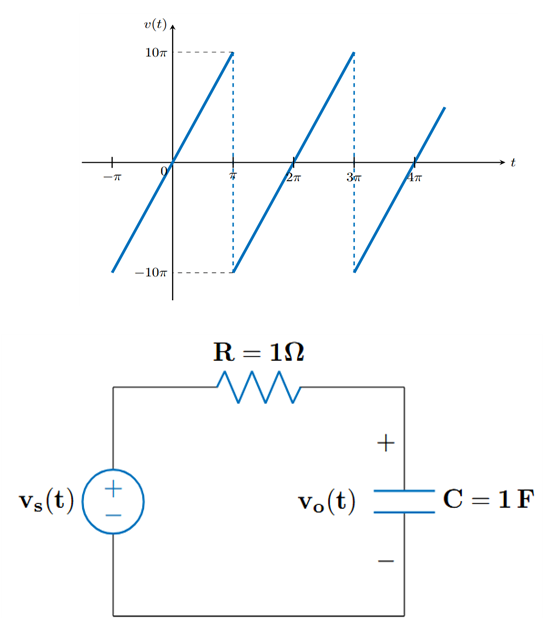 다음과 같은 주기 T = 2\pi, 최대 진폭 V_m = 10\pi인 톱니파 전압 신호 v_s(t)가 다음 RC 회로에 인가된다. 이 때 출력 전압 v_o(t)의 출력 전압의 기본 주파수 성분의 진폭으로 알맞은 것은?