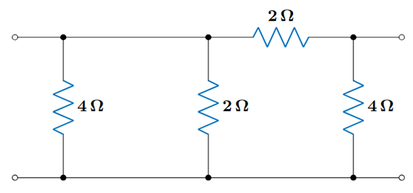 H_{22} = \frac{I_2}{V_2}|_{I_1=0} 이다. I_1 = 0 으로 두고 계산하면 V_2 = (4||(2 + 2||4))I_2 = \frac{20}{11}I_2 가 되므로 H_{22} = \frac{11}{20} 이다. 따라서 답은 ④이다.
