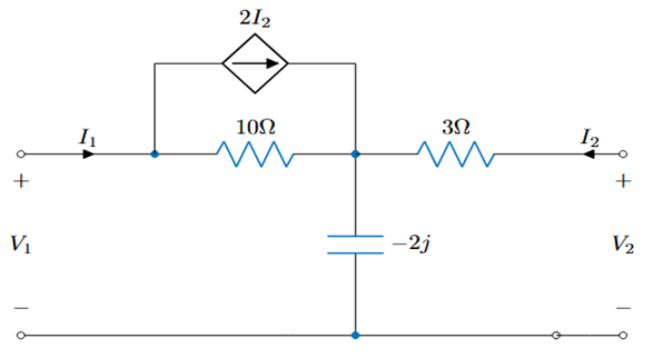 H_{21} = \frac{I_2}{I_1}|_{V_2=0} 이다. V_2 = 0 으로 두고 계산한다. 커패시터에 흐르는 전류는 I_1 + I_2 이므로 가운데 노드의 전압은 (I_1 + I_2)(-j2) 이다. 또한 가운데 노드의 전압은 -3I_2 이므로 둘을 같다고 두고 전개하면 H_{21} = \frac{I_2}{I_1} = \frac{j2}{3 - j2} = \frac{-4 + j6}{13} 이다. 따라서 답은 ②이다