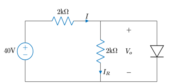 다이오드에 순방향 바이어스가 걸리므로 켜진 상태이며, 이상적인 다이오드 모델에서는 단락으로 동작한다. 따라서 40V 전압원과 2k 저항 하나만 남은 회로이므로 I = 20mA이다. 따라서 답은 ④이다.