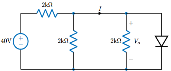 다이오드에 순방향 바이어스가 걸리므로 켜진 상태이며, 이상적인 다이오드 모델에서는 단락으로 동작한다. 따라서 40V 전압원과 2k 저항 하나만 남은 회로이므로 I = 20mA이다. 따라서 답은 ④이다.