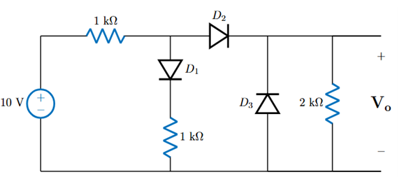 다음 회로에서 이상적인 다이오드 모델을 사용하여 구한 V_o 값으로 알맞은 것은?