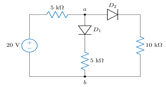 D1, D2에 순방향 바이어스가 걸려 켜진 상태이므로 단락으로 작동한다. 따라서 Z_{ab} = 5k||10k||5k = 2k 이므로 답은 ②이다.