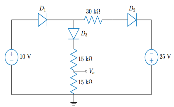 D1, D2, D3에 순방향 바이어스가 걸려 켜진 상태이고, 단락으로 작동한다. 따라서 V_o = \frac{15k}{15k + 15k} \cdot 10V = 5V 이므로 답은 ④이다.