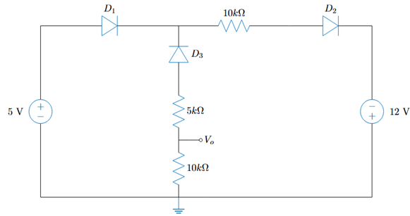 다음 회로에서 이상적인 다이오드 모델을 사용하여 구한 V_o 값으로 알맞은 것은?