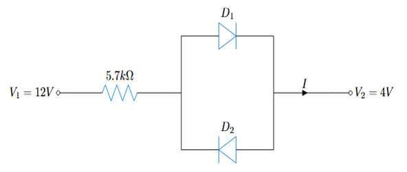 다음 회로에서 다이오드 D_1 전압은 0.7\text{V}이고, 다이오드 D_2 전압은 0.6\text{V}이다. I값 으로 알맞은 것은?